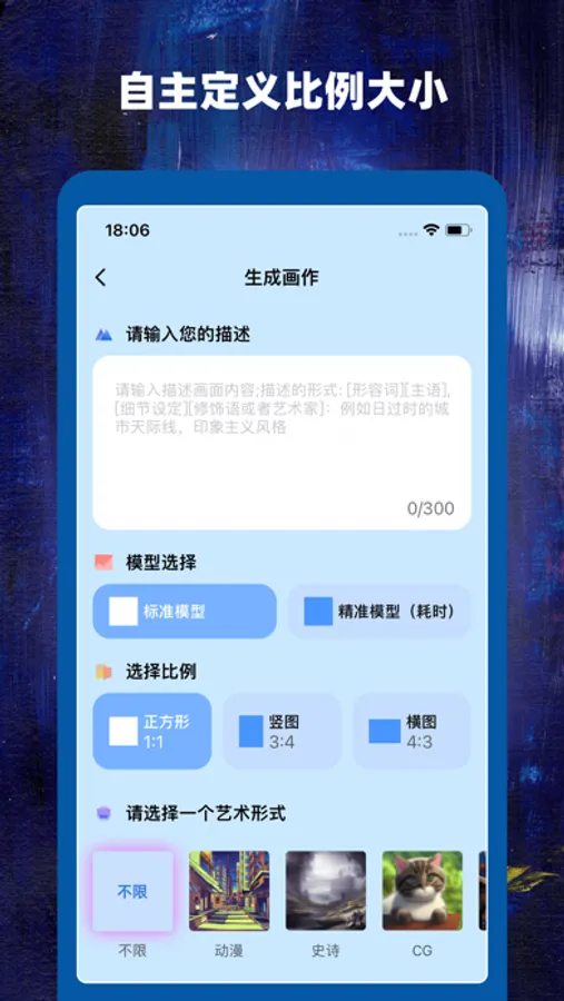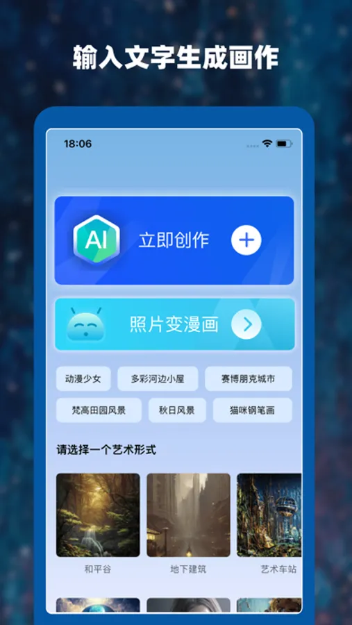 将文字变成迷人的数字艺术品,您需要做的就是输入文字描述, 选择一种艺术风格即可在几秒钟内将您的想法变为现实! 轻松将文字转化为视觉内容 从详细的文字描述生成图像超级简单:只需描述您希望绘制的内容——例如“海底生活”或“破碎的彩虹”,然后点击创建!