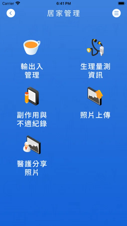 2. 居家管理: 生理量測記錄、居家飲食輸出入紀錄、副作用併發症與異常狀況即時記錄