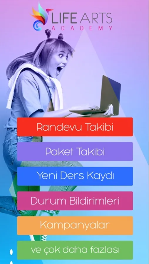 Uygulamanın telefonunuza indirebilir ve Life Arts Academy'yi inceleyebilirsiniz. Uygulamayı kurduktan sonra “Kayıt ol” linkine tıklayarak bizlere öğrenci olma talebinizi iletebilirsiniz. Sonrasında açılan ekranda Kullanıcı adı (E-posta adresiniz) ve Şifre bölümlerini tamamlayıp uygulamanızı kullanmaya başlayabilirsiniz.