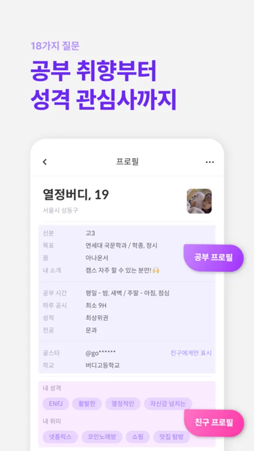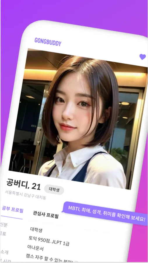 공버디에서는 10대 20대 관심사에 맞는 맞춤 프로필로