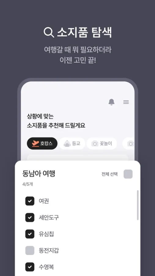 날씨, 상황, 카테고리에 따라 소지품을 추천해요
