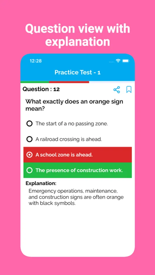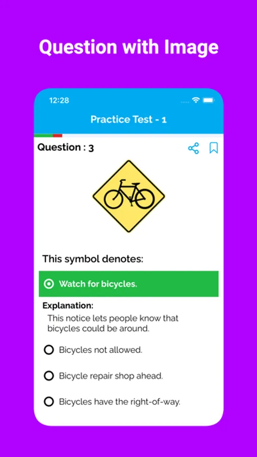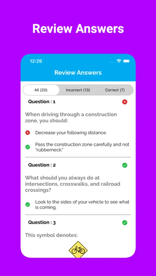 Our app includes a variety of practice questions for the Driver's license exam for Car, Motorcycle and Commercial Vehicles. These questions are based on the official handbook of different states.