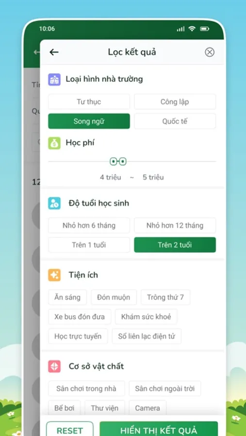 Cho phép tìm kiếm trường và trung tâm học theo khu vực sinh sống: Đọc review, đánh giá chi tiết về cơ sở vật chất, chương trình học, đội ngũ giáo viên, học phí, tiện ích, chế độ dinh dưỡng; tham quan trường “trực tuyến” qua hình ảnh, video…