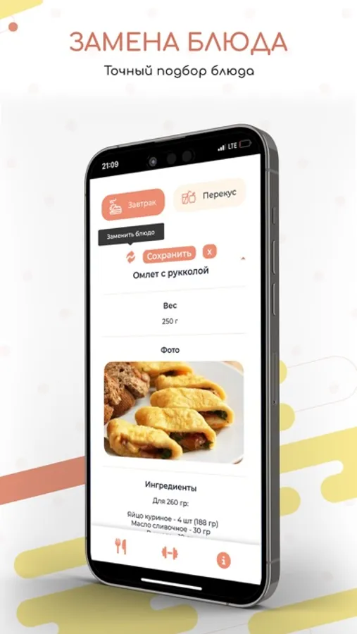 - возможность замены блюд в уже готовом плане питания для более точного подбора