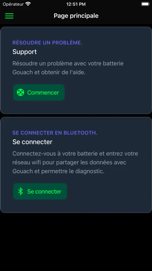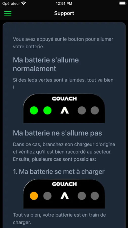 This app lets you connect to your Gouach battery using Bluetooth, and do a self-diagnostic in case of issues.