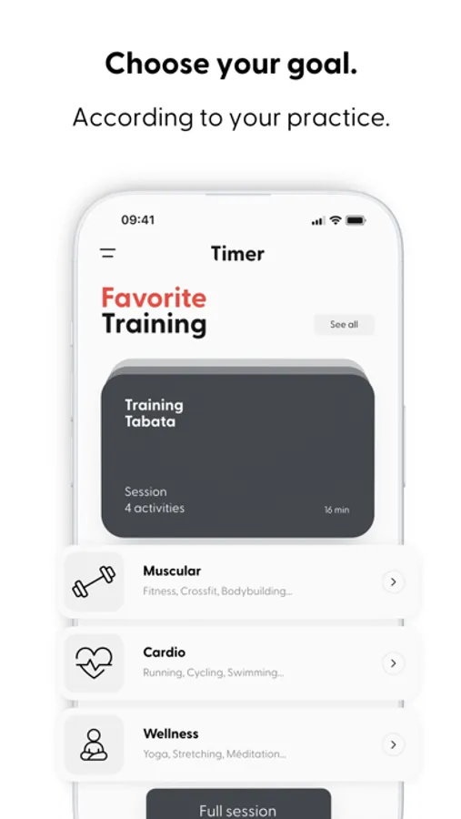 Our unique mobile application combines all the sports timers to adapt to your personal goals (muscle building, cardio, or wellness), no matter where you are. It is user-friendly and will allow you to train with a free mind, without worrying about the time passing.
