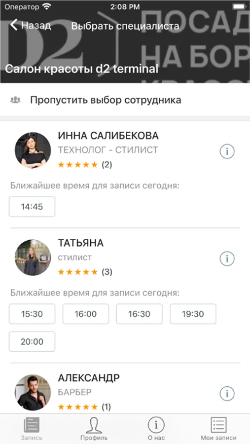 - простая и удобная запись в D2 TERMINAL к любимым мастерам в любое время 24/7;