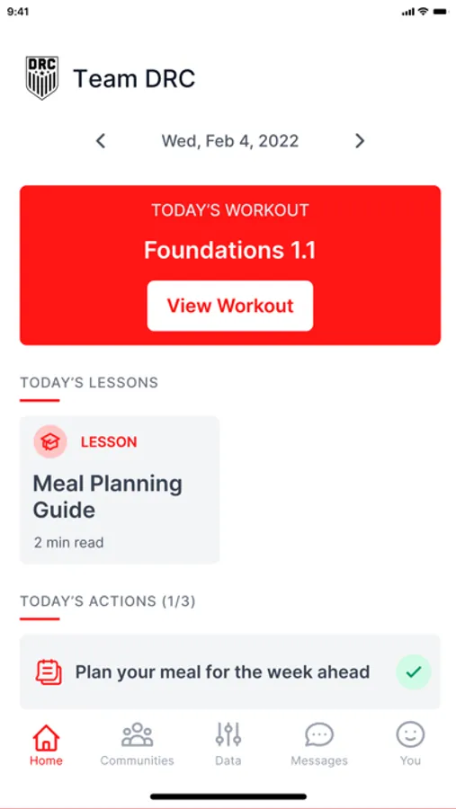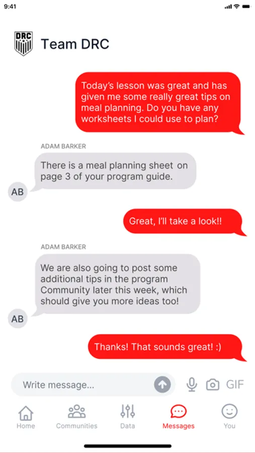 The Team DRC app is designed for clients of trainers who have enrolled in the Team DRC program. The app will send push notifications and prompt clients to answer yes/no question in regards to comply with healthy habits sent by your coach.