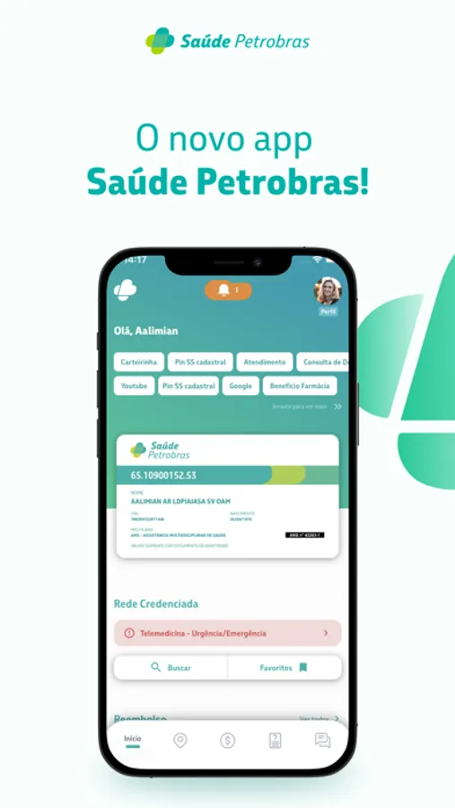 O novo app da Saúde Petrobras! Com ele você terá acesso a todos os principais serviços e funcionalidades disponibilizados pelo seu plano de saúde na palma da sua mão! Verifique a rede credenciada de profissionais em sua região, acompanhe reembolsos e outras solicitações, acesse a sua carteirinha digital com praticidade, e muito mais!