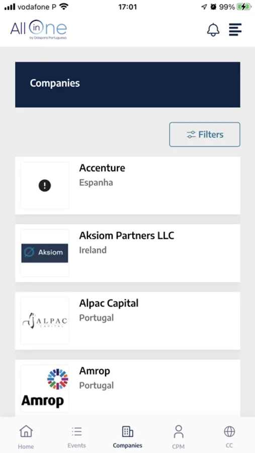 A app All in One é a versão móvel da plataforma All in One, criada pelo Conselho da Diáspora Portuguesa, com o intuito de conectar toda a sua extensa rede de Conselheiros de Portugal no Mundo e membros do Conselho Consultivo.