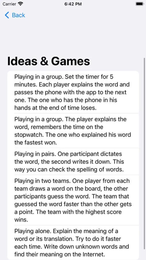 - Going to "How can we use the app?" you can view the suggested list of ideas and games using Scientific Word Generator.