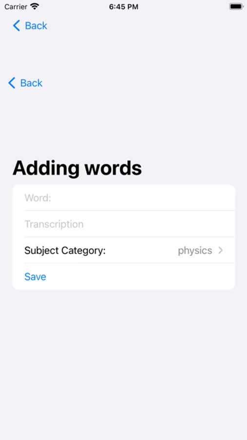 To add other word, go to "View words" → "Add word". There you add a word, its transcription and select a category.