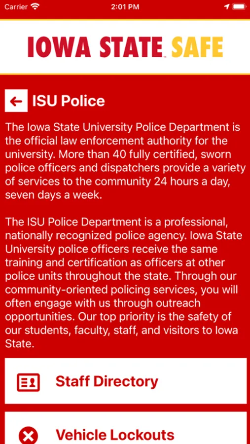 Iowa State Safe is the official safety app of Iowa State University. It is the only app that integrates with Iowa State University's safety and security systems. The ISU Police has worked to develop a unique app that provides students, faculty and staff with added safety on the Iowa State University campus. The app will send you important safety alerts and provide instant access to campus safety resources.
