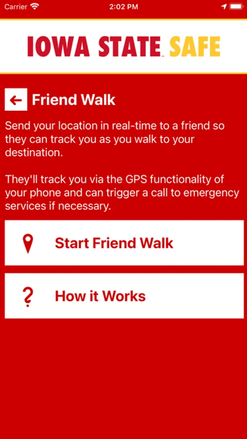 - Friend Walk: Send your location to a friend through email or SMS on your device. Once the friend accepts the Friend Walk request, the user picks their destination and their friend tracks their location in real time; they can keep an eye on them to make sure they make it safely to their destination.