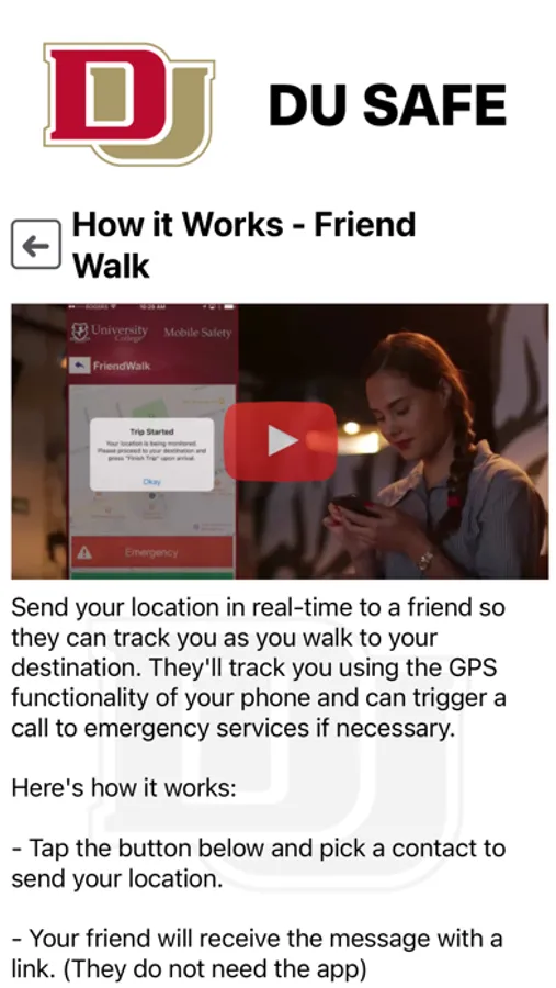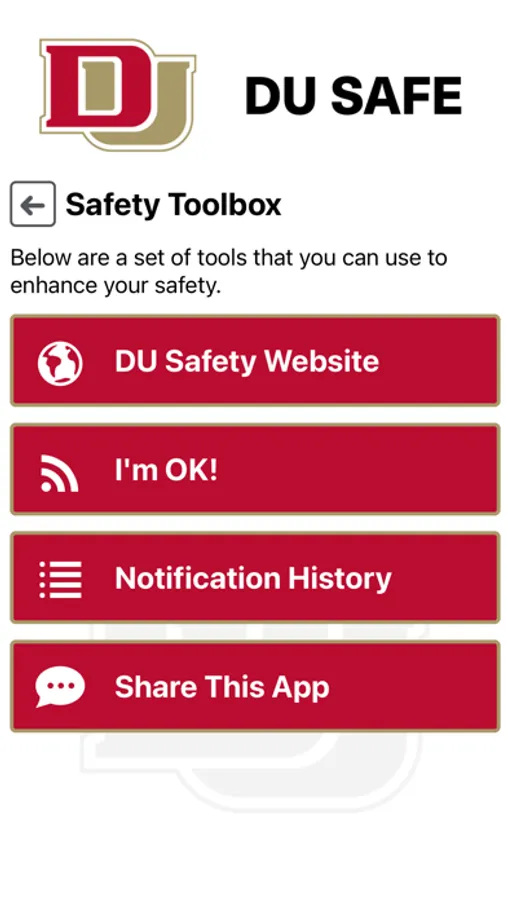 DU Safe is an essential tool to enhance your safety at University of Denver. The app will send you important safety alerts and provide instant access to campus safety resources. DU Safe is the official mobile safety app Of University of Denver.