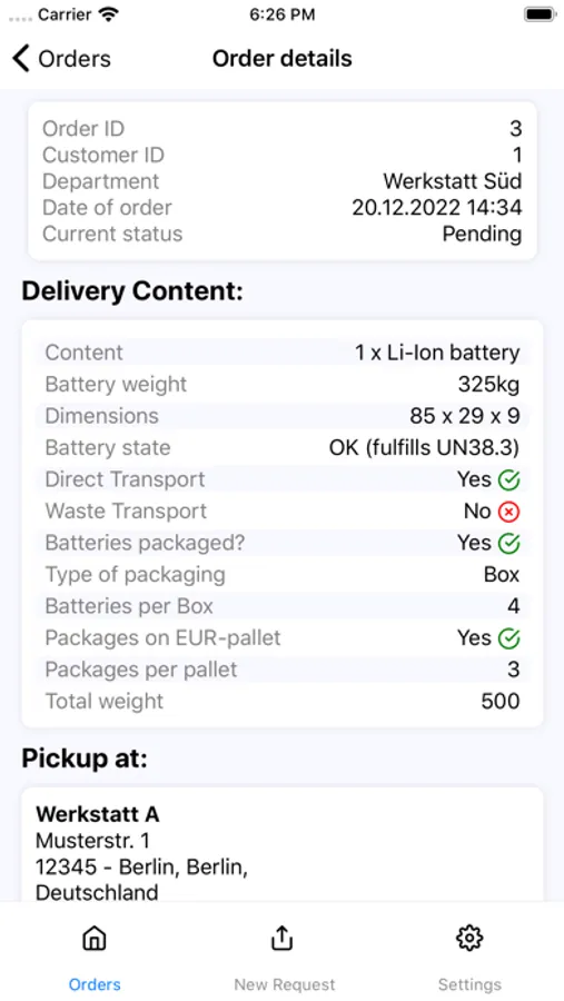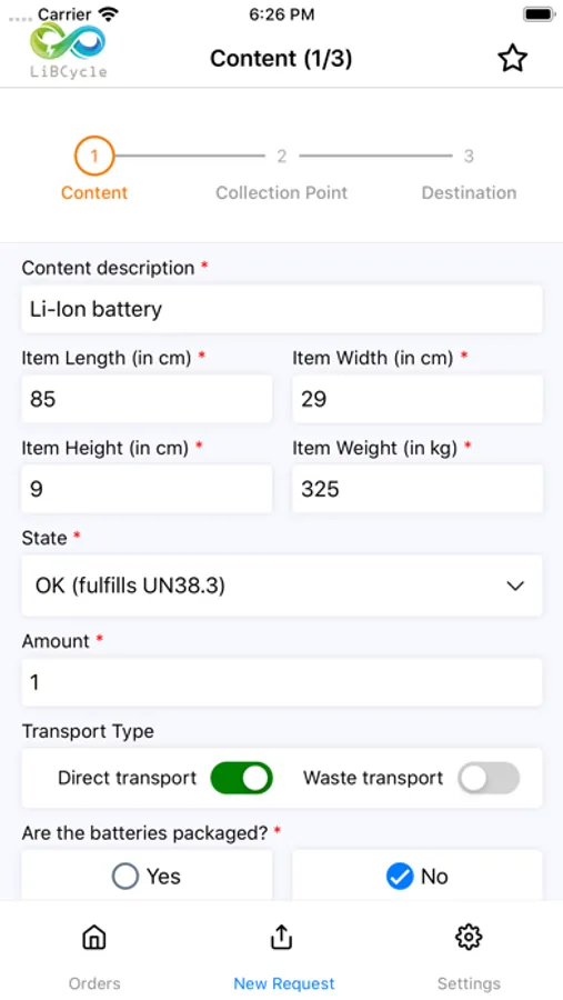 To improve this communication between our customers and LiBCycle is the purpose of this app. After contacting us directly via mail or phone, we can arrange contract details and provide you with login details for the app. This then allows you to request transports via a simple form, which gives us all the information we need for a successfull battery transport.