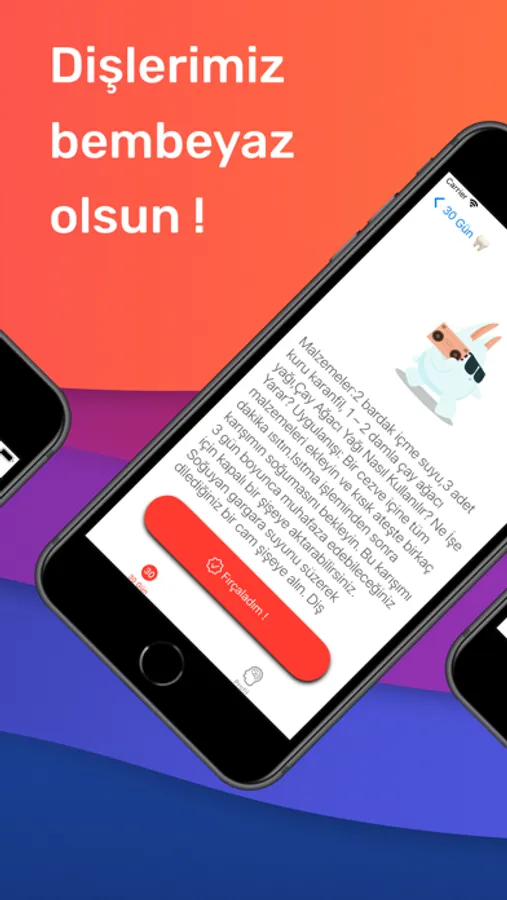 30 gün boyunca dişlerini düzenli olarak fırçalamak ister misin ? Alarmı kur her gün sana hatırlatmamıza izin ver ..Amacımız diş fırçalama alışkanlığı kazanmak ve düzen sağlamak