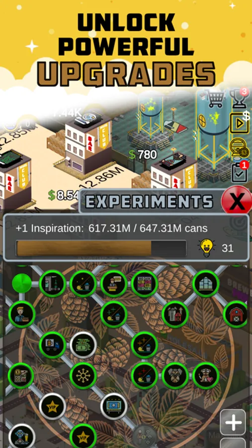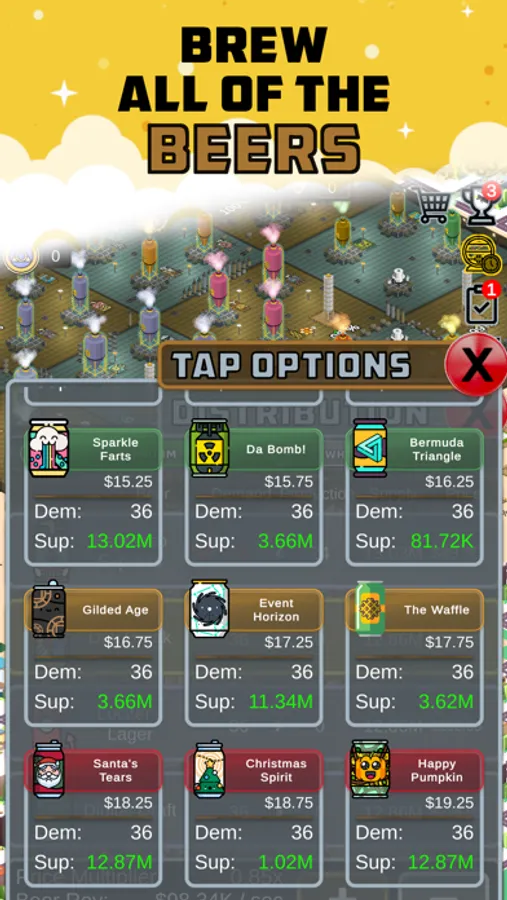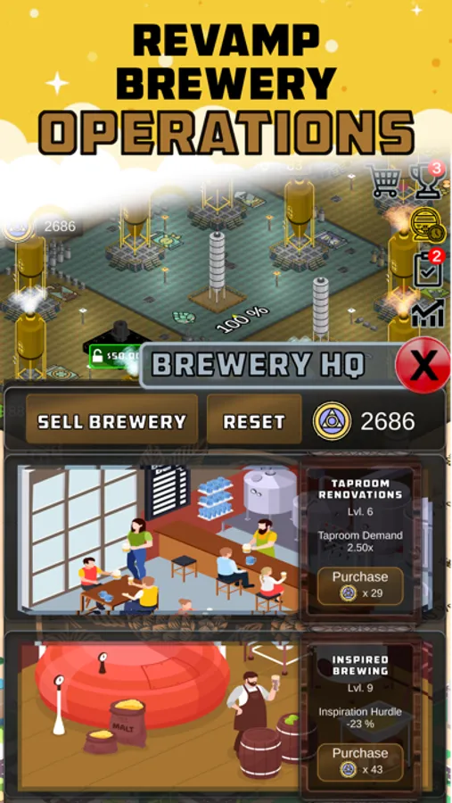 Grow your brewery and unlock permanent HQ upgrades by selling your successful brewery and reinvesting in a larger one. Unlock late-game experiments like robot bartenders, brewers guild membership, flagship beer selection, and more.