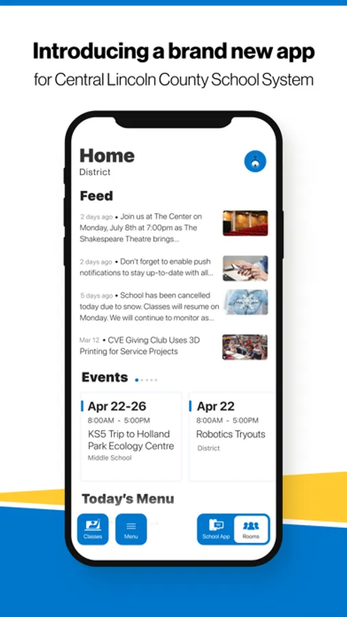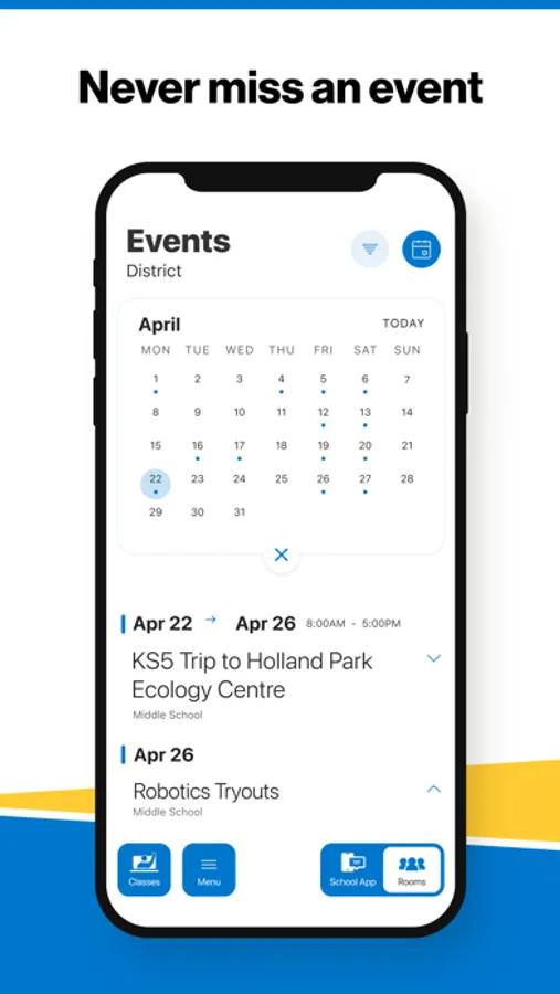 The event section shows a list of events throughout the district. Users can add an event to their calendar to share the event with friends and family with one tap.