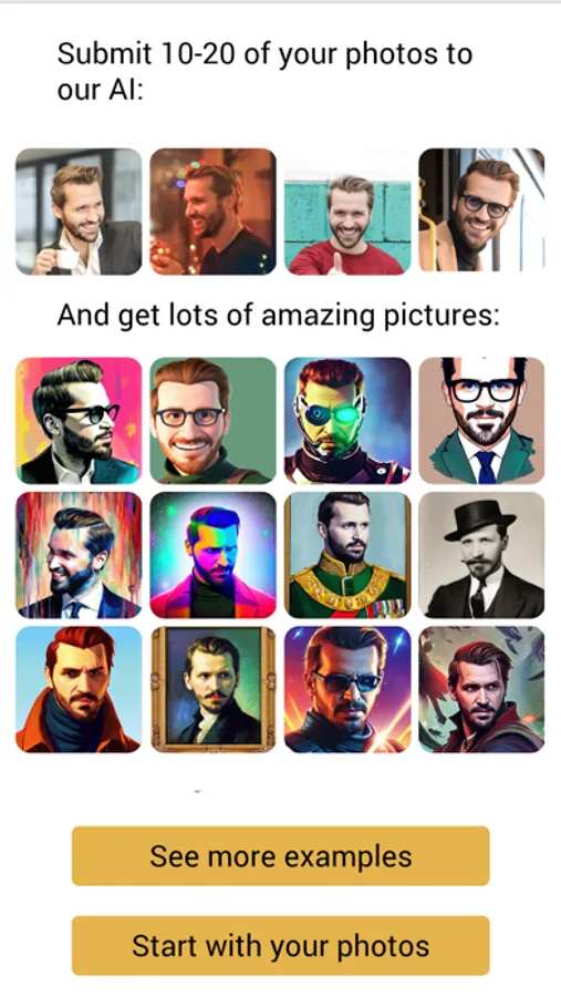 Upload 10-20 photos of yourself and get 100+ avatars in different styles and themes.