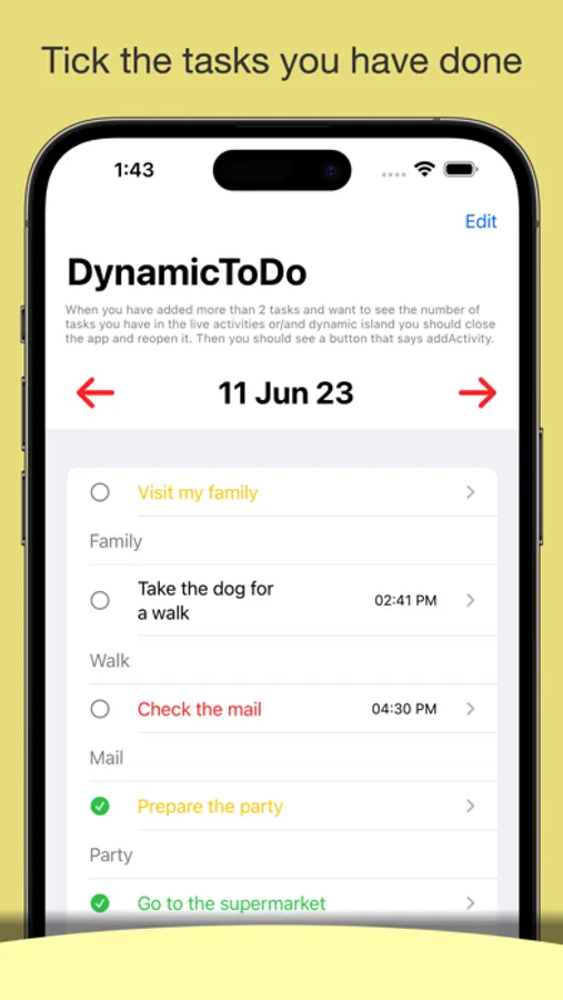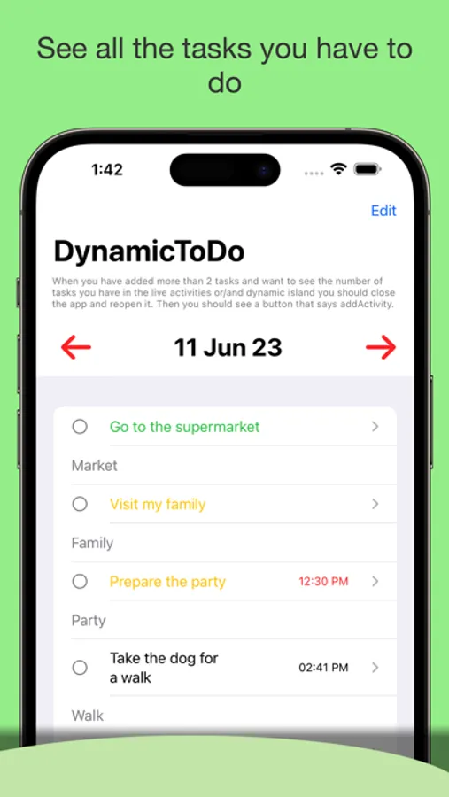 DynamicToDo is an app in which you can set the tasks you need to do for today or for another day. Also, if you want, you can choose to see the number of tasks at any moment, just looking at your live activities (or if you have an iPhone 14 Pro or Pro Max you can see them on the Dynamic Island).