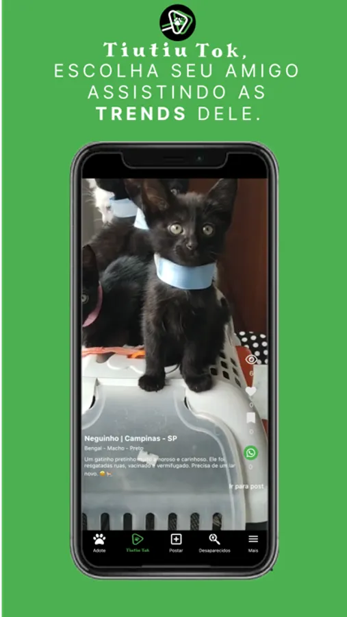O App traz uma funcionalidade ÚNICA no segmento, chamada Tiutiu Tok que permite que você visualize os PETs numa lista de vídeos, semelhante ao famoso aplicativo de vídeos. Dentre outras funcionalidades,