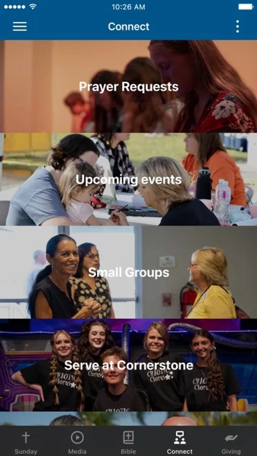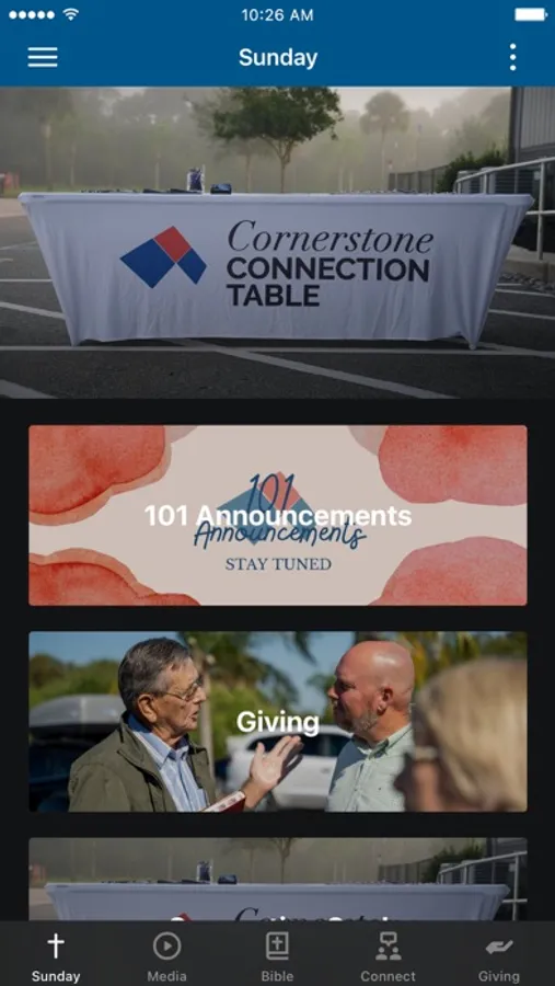 This app will help you stay connected with the day-to-day life of Cornerstone Church. With this app you can: watch or listen to past messages; stay up to date with push notifications; share your favorite messages via Twitter, Facebook, or email; download messages for offline listening, and communicate with other members of your small groups or serving groups.