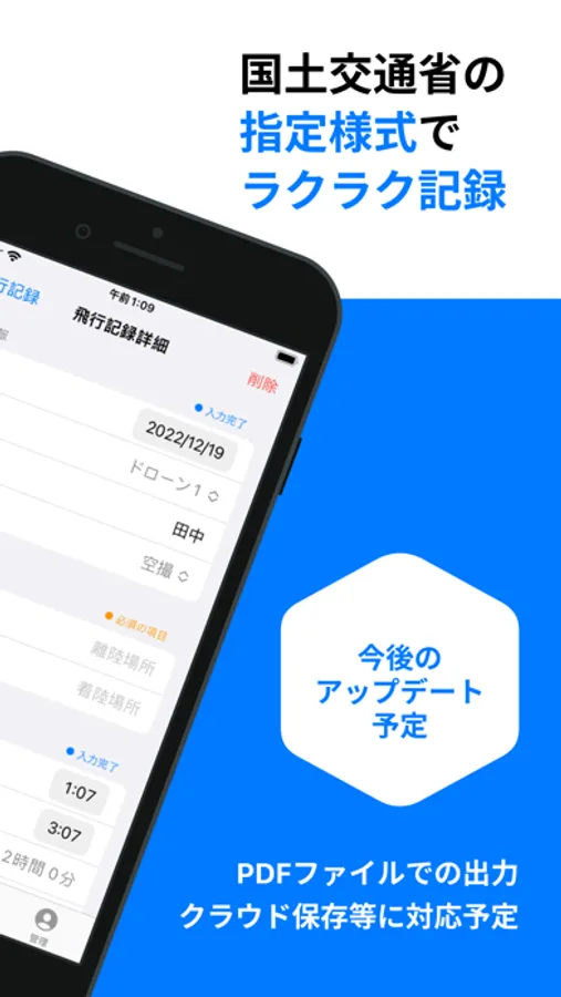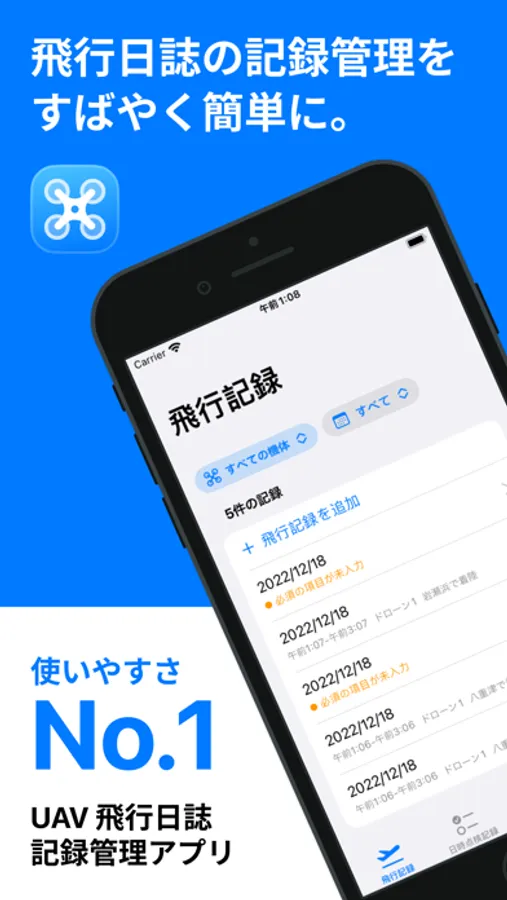 UAV 飛行日誌(UAV Flight Log) は2022年12月より改正航空法によって、100g以上のドローンでの特定飛行に関して記録と保管・飛行を行う際に携帯が必要になった「無人航空機の飛行日誌」を素早く簡単に作成・管理できるAppです。