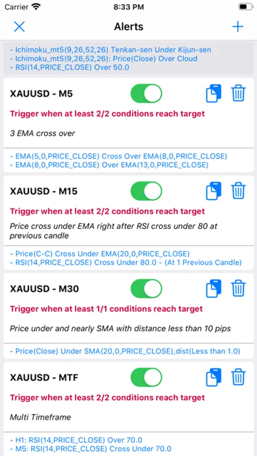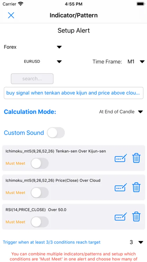 - Full custom your indicators/patterns signal include custom parameter, combine many indicators/patterns and custom your technical analytics in one alert.