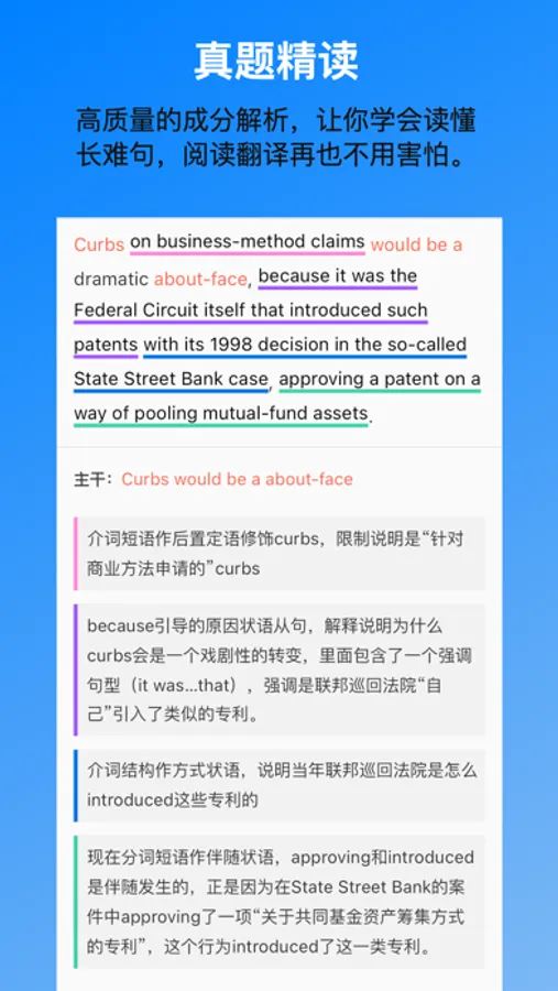 轻松高效精读完 100 篇考研真题原文,让你学透真题,轻松提分。我们将近10年的100篇真题原文,根据内容整理为8大分类。让你按分类逐步精读完100篇。在精读过程中,通过单词收藏+单词抽查,让考研重点单词一个都逃不掉。通过长难句成分解析和句子翻译,让你学会读懂长难句,阅读翻译再也不用害怕。