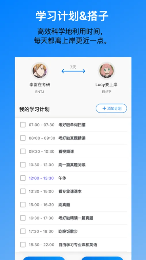 第一,你可以制定你的个人学习计划,更高效科学地利用时间,让学习过程更有目标和节奏。第二,你可以每天完成学习计划并打卡获得浮力,让你的努力都看得见,坚持变得更容易,每天都离上岸更近一点。第三,你还可以添加你的学习搭子,分享彼此学习计划、互相激励和监督,结伴而行,漫漫学习路再也不孤单。