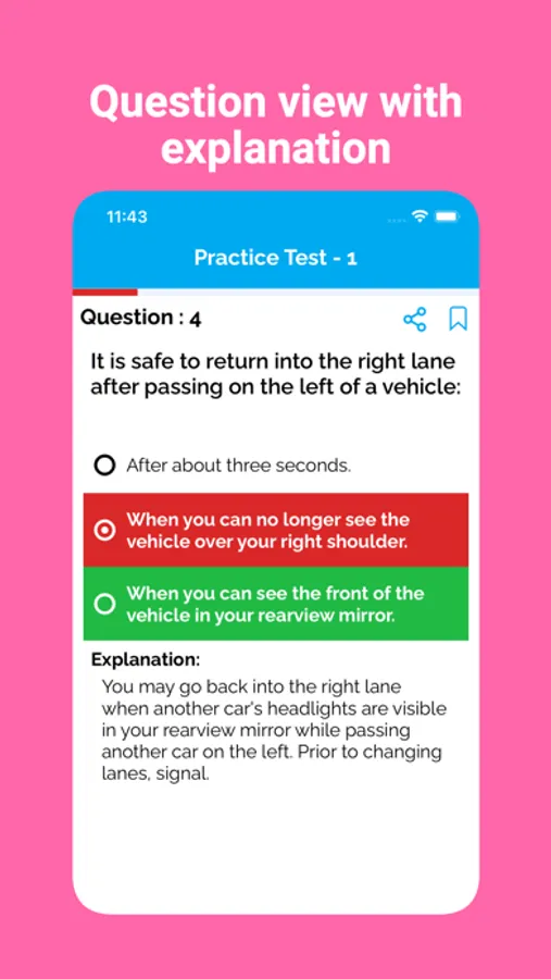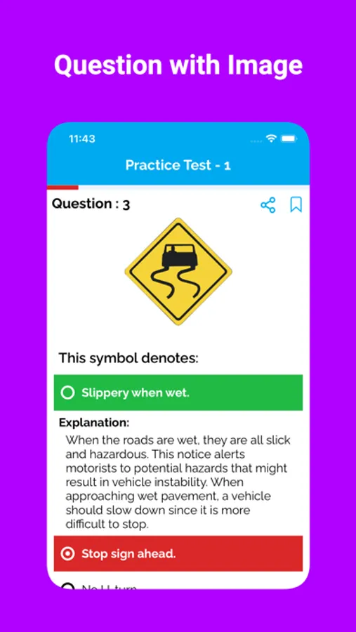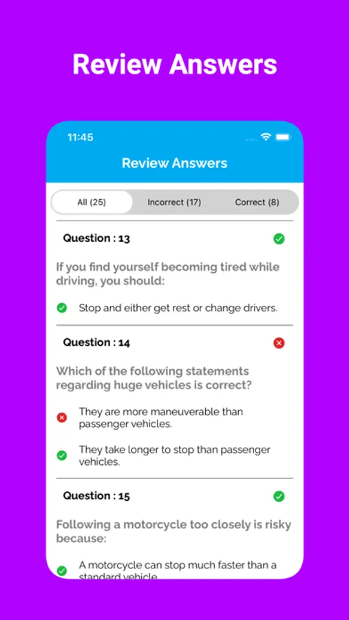 Our app includes a variety of practice questions for the Driver's license exam for Car, Motorcycle and Commercial Vehicles. These questions are based on the official handbook of different states.