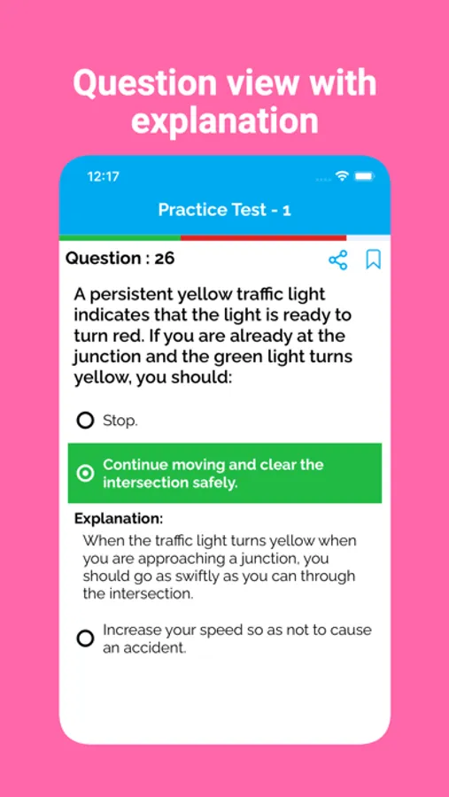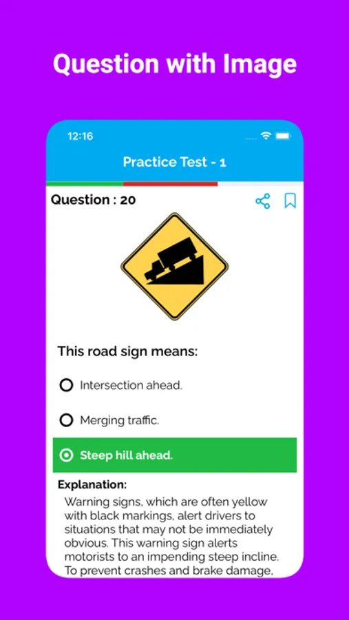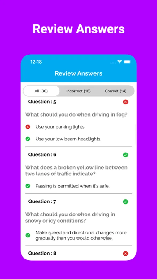 Our app includes a variety of practice questions for the Driver's license exam for Car, Motorcycle and Commercial Vehicles. These questions are based on the official handbook of different states.