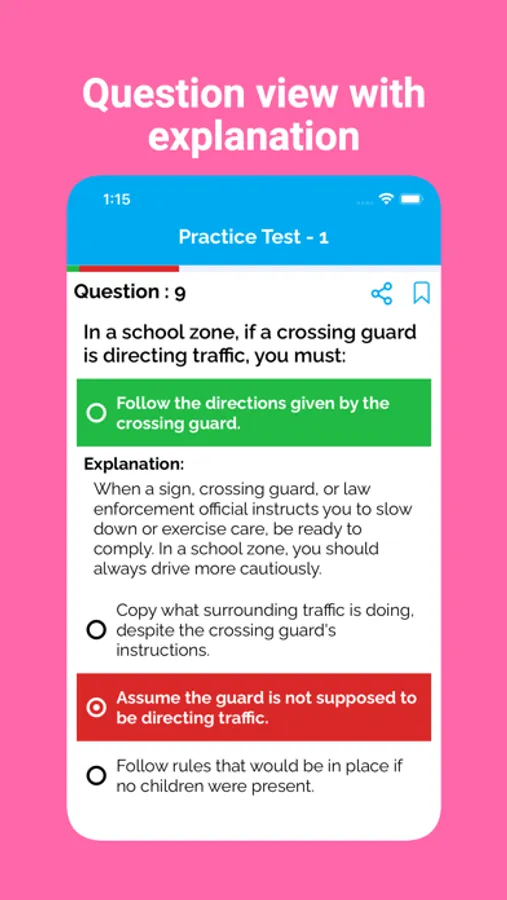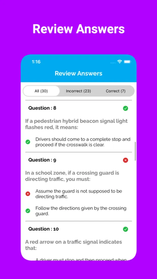 Our app includes a variety of practice questions for the Driver's license exam for Car, Motorcycle and Commercial Vehicles. These questions are based on the official handbook of different states.