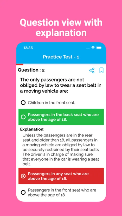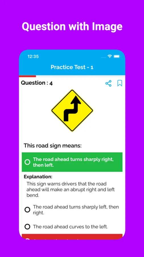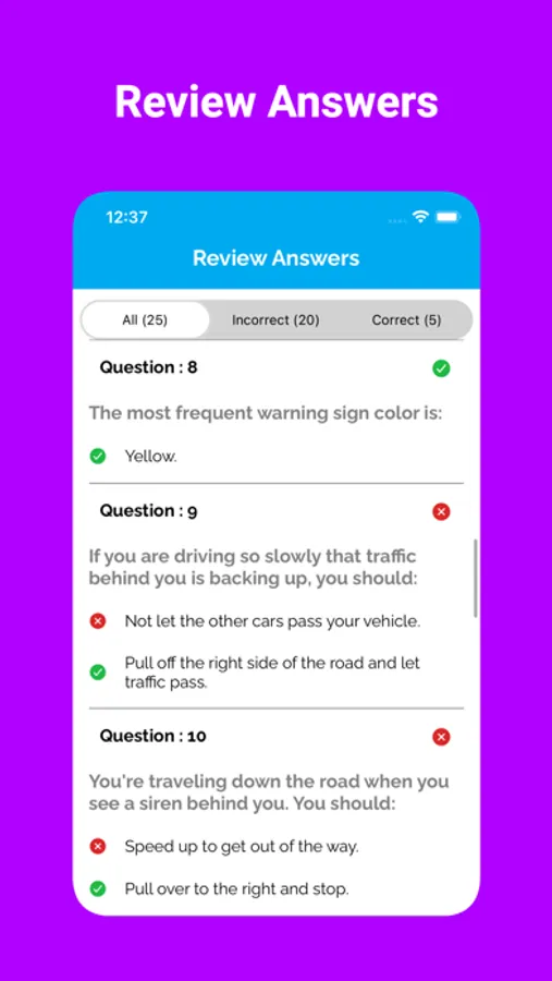 Our app includes a variety of practice questions for the Driver's license exam for Car, Motorcycle and Commercial Vehicles. These questions are based on the official handbook of different states.