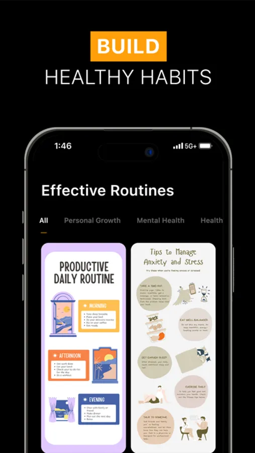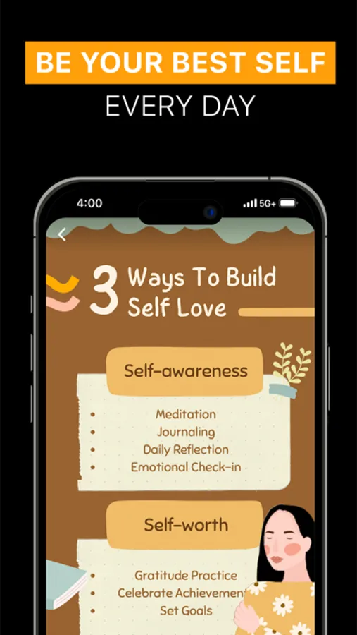 At the app's core is a comprehensive course covering a wide range of topics, including self-esteem, relationships, stress management, and much more. With each mini-course, you'll gain valuable knowledge, tools, and skills to help you change your habits and reach your goals.