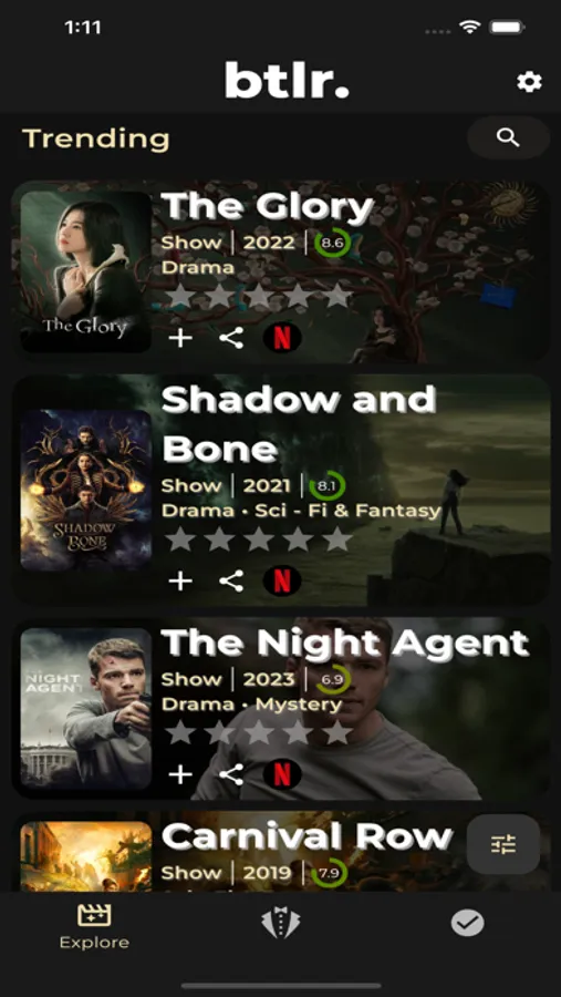 With btlr., you'll never waste time searching for something to watch again. Every day, our app curates a list of new movies and TV shows that are available at your subscribed streaming providers, saving you hours of endless scrolling and browsing. With a simple and user-friendly interface, you can easily browse through recommended titles, watch trailers, and save your favorites to watch later.