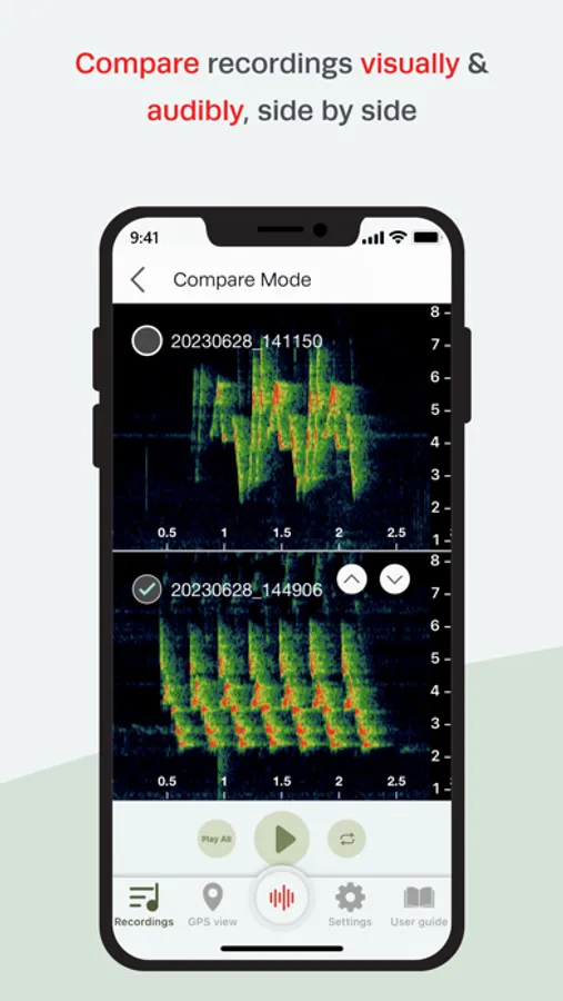 View waveforms or spectrograms and listen to your recordings at your convenience. Use Compare Mode to juxtapose two recordings for detailed analysis.
