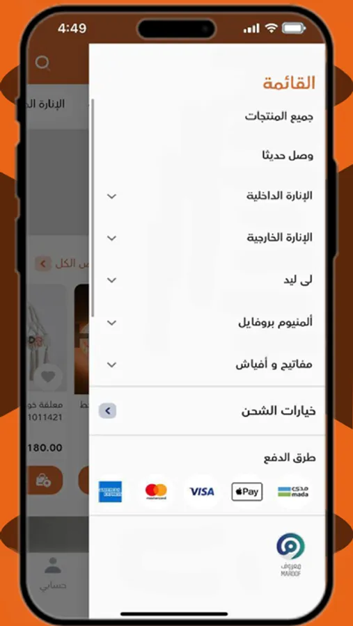 (ثريات - معلقات -سبوت لايت - اطارات - تراك لايت - جداريات خارجية - لمبات بجميع أنواعها -مفاتيح و أفياش - انارة الحدائق -ليدات داخلى وخارجى )