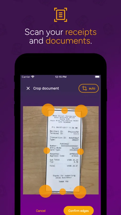 Managing all your business documents is now easier than ever with this simple solution. SparkReceipt features an advanced receipt scanner with OCR technology. This allows you to easily scan receipts, crop images, digitize documents, and store all bank statements, or other documents in the cloud.
