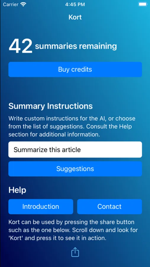 Introducing Kort - the ultimate text summarization tool for busy professionals and students! With Kort, you can easily summarize any webpage with just a click of a button. Our powerful extension allows you to quickly and easily understand the main points of any text, saving you valuable time and effort. And for those who want even more control, Kort also gives you the ability to customize your own prompts to make sure your summaries are tailored to your needs. Download Kort today and start saving time and simplifying your reading experience!