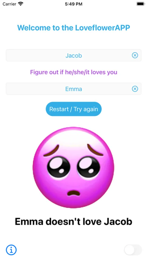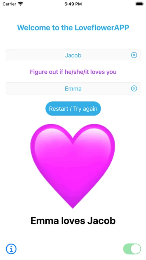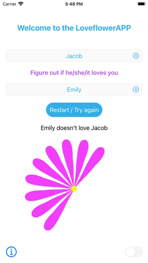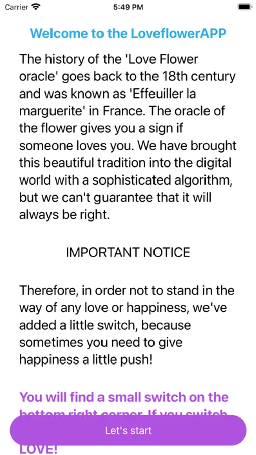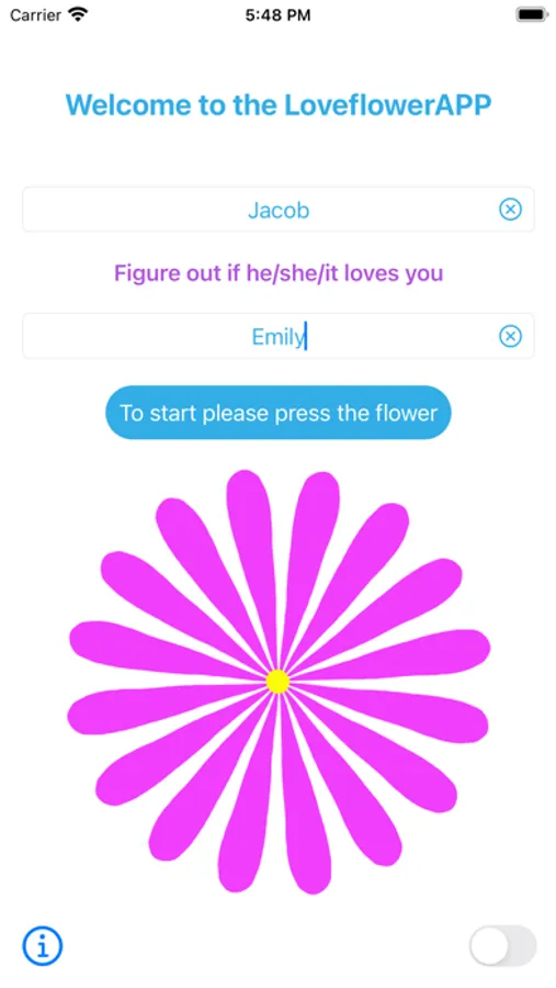 Find out if he/she/it loves you. The history of the 'Love Flower oracle' goes back to the 18th century and was known as 'Effeuiller la marguerite' in France. The oracle of the flower gives you a sign if someone loves you. We have brought this beautiful tradition of plucking the petals into the digital world with a sophisticated algorithm, but we can't guarantee that it will always be right.