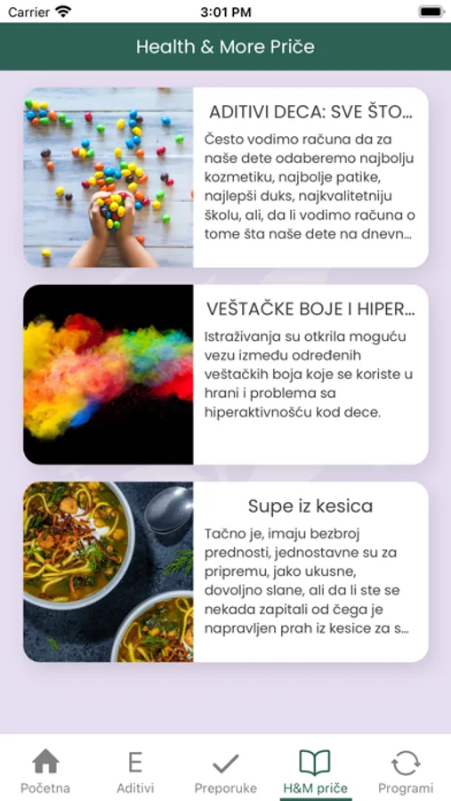 Imajući u vidu činjenicu da su mnogi aditivi, koji su korišćeni kao bezbedni, nakon 10, 15 ili čak 20 godina isključeni iz upotrebe zbog dokazane genotoksičnosti, kancerogenosti, neurotoksičnosti i sličnih neželjenih dejstava, ova aplikacija pruža uvid u sve aditive, koji su dozvoljeni za ljudsku upotrebu, a za koje postoji sumnja da mogu biti štetni.