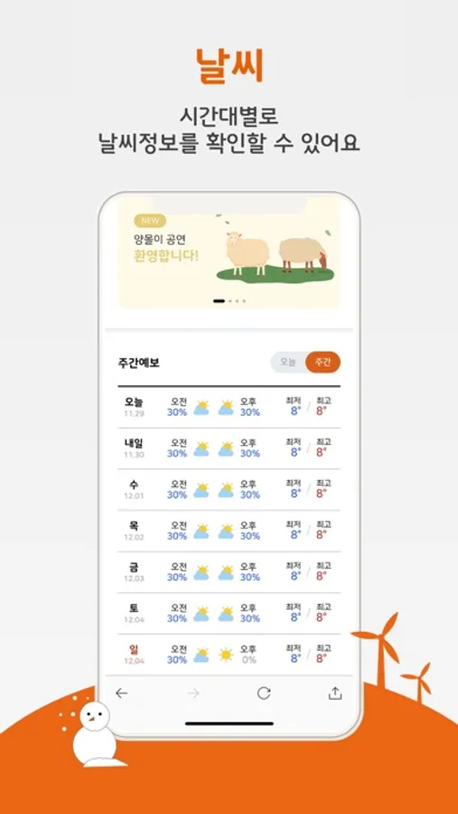 일간/주간대별로 날씨정보를 확인할 수 있습니다.