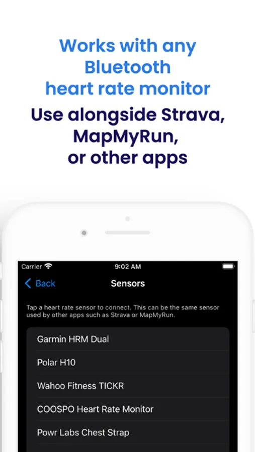 Works with all bluetooth heart rate monitors, including Garmin, Polar, and Wahoo.