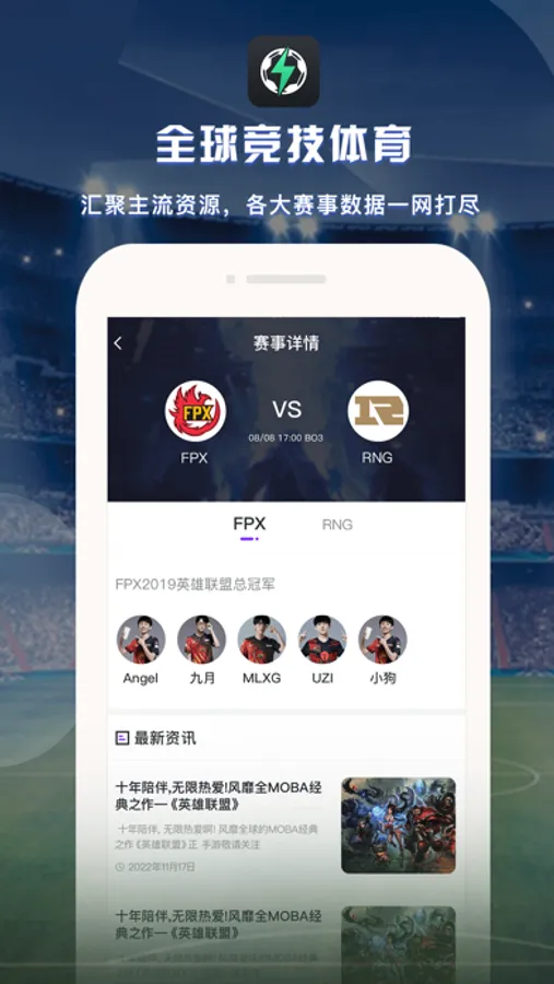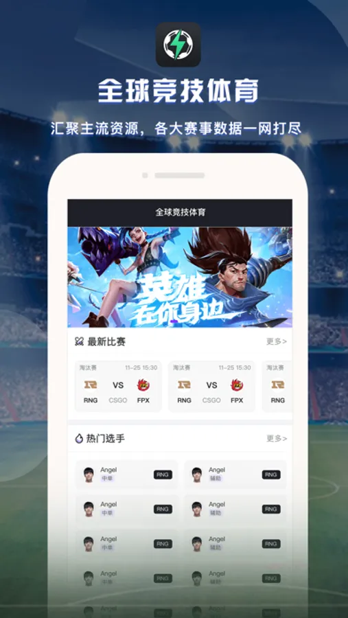 英雄联盟,DOTA2,CS:GO,王者荣耀等更多体育竞技,涵盖240多个联赛和5000多场比赛。比分即时更新,快,准,全的数据统计,现场分析和亲临现场般的比分速度,助你轻松掌握比赛走向。