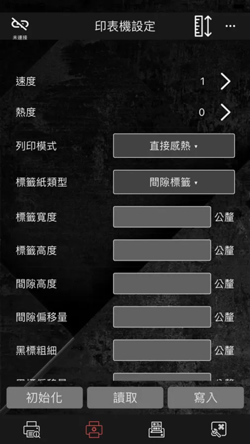 *列印設置-標籤紙類型、標籤高度、標籤寬度、列印速度、列印熱度等