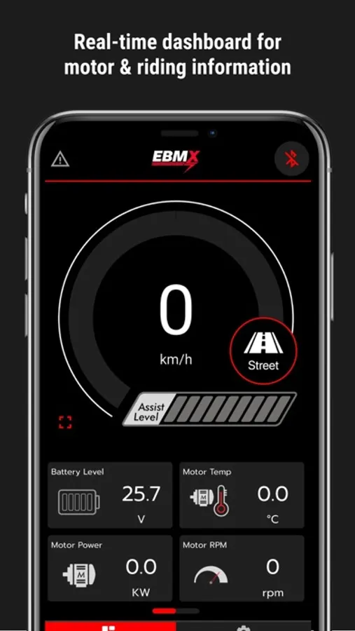 The EBMX X-9000 app has two purposes. Firstly, it functions as an information dashboard displaying speed, power levels, and real-time bike statistics such as power consumption, temperatures, rpm, and odometer (plus more).
