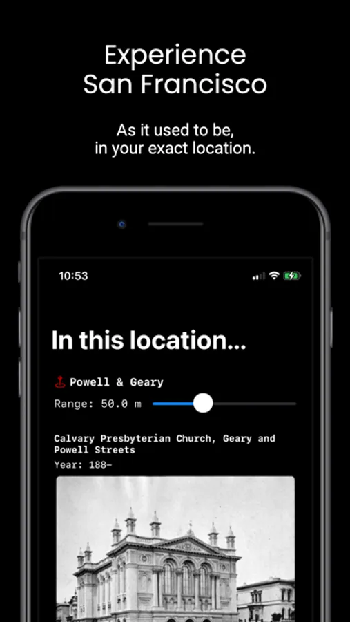Experience San Francisco like never before. Open the app and see photos taken in the 20th century (and sometimes even earlier!) in your exact location. Happy exploring!