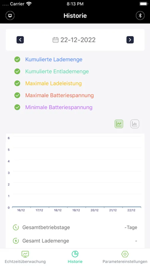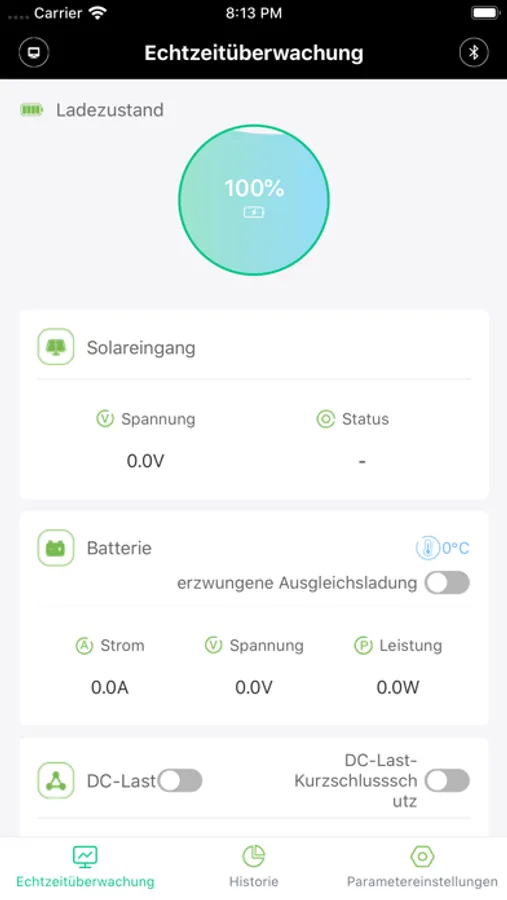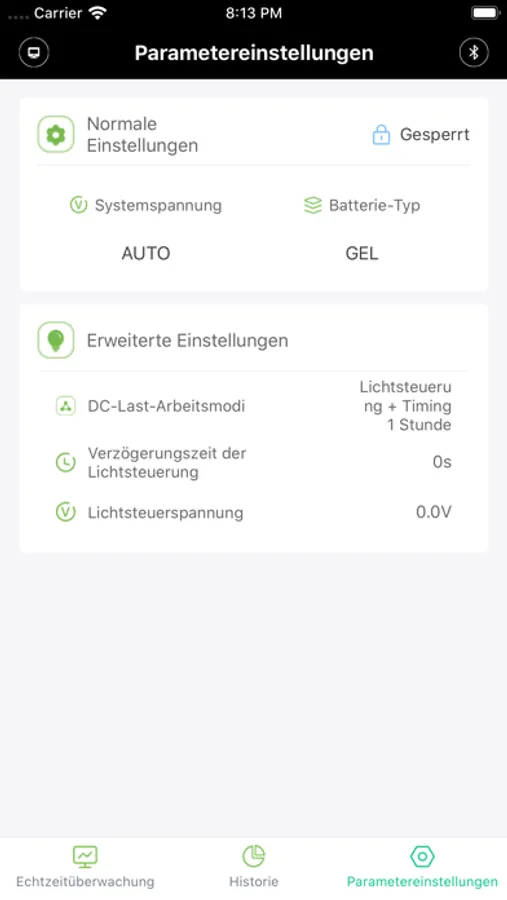MSC MPPT wird als abgesetztes Anzeige- und Bedienfeld für den entsprechenden Solarladeregler verwendet (für die Verwendung ist ein externes oder eingebautes BT-Modul erforderlich). Durch den Betrieb auf dieser APP können Sie den Status von PV, Batterie, DC-Last für das Solar-DC-Ladesystem mit Laderegler überprüfen.